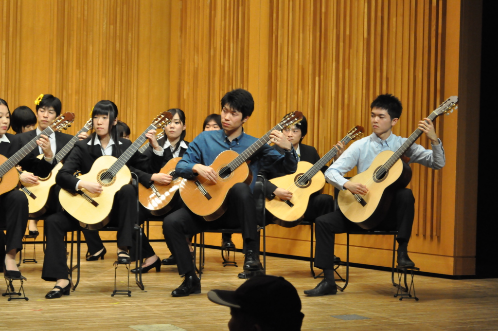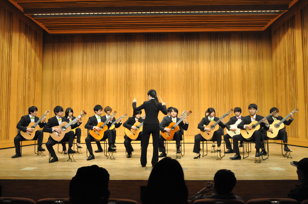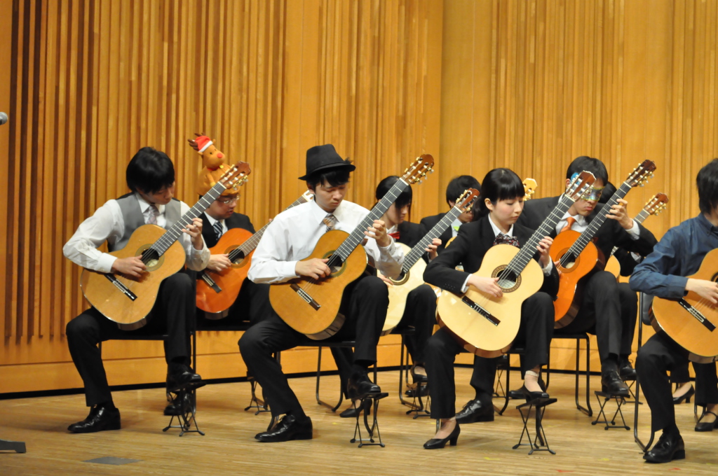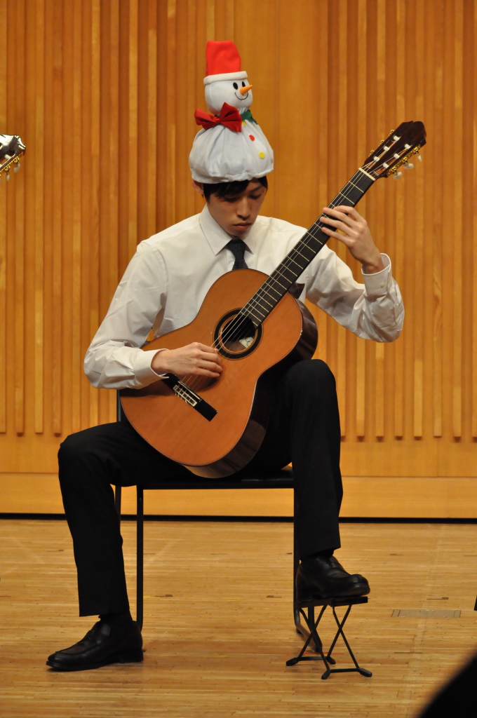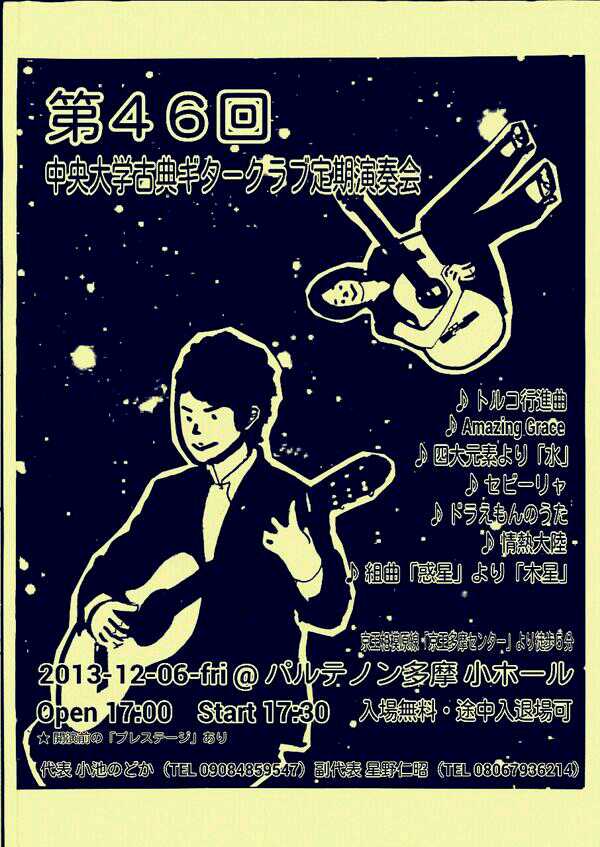 第46回定期演奏会!! 活動記録 2014年01月26日 12月6日(金)に、中央大学古典ギタークラブの第46回定期演奏会が、パルテノン多摩にて開催されました!朝早くに集合し、動きの確認やリハーサルなど開演までの入念な準備をします。 演奏会の総指揮を取る古澤。頼れる男とは彼のこと。 男子部屋の様子。黒田さんがパンフに写る自分を何度も見ていました。 リハーサル裏ドア前の様子。緊張しつつも楽しみながら本番に備えます。また、今年は様々な衣装を揃えました。 東風のハットとネクタイ。カッコいい! さっそくハットで被るコントラバヒッシモ。 雪だるまの調節に余念がない古澤。 今年は曲数が多かったので、リハーサルの終了時刻が予定を大幅に過ぎたりとハプニングもありましたが、無事進行することが出来ました。 この後円陣を組んで気合を入れます。部長が何て言ってたかは覚えてないです。 出番が待ちきれない!そしてついに!待ちに待った演奏会がスタート! ープログラム0ー『Wedding Bell』二人が会場を温かい雰囲気に包みます。衣装すごいです。私たち、結婚します。 ープログラム1ー『ドラえもんのうた』最初の掛け声に全てを込めました。ギターは僕たちを引き合わせたひみつ道具のようなものでした。(加賀江) ープログラム2ー『東風』全体合奏を編曲してくださった大野元毅先生にギターアレンジを手掛けていただきました。5人とも曲の不思議でカッコいい世界観を表現出来ていたと思います。 ープログラム3ー『リベルタンゴ』2年生5人によるピアソラのリベルタンゴ。情熱的で激しい旋律と、最後の荒井の指パッチンに注目です。 荒井の指パッチンを真似する一年生たち。ープログラム4ー『セビーリャ』ぐっさんの堂々とした演奏。来年も独奏で出演すれば定演独奏皆勤賞です。 ープログラム5ー『Summer』季節は反対ですが、人生を思い返したくなるような味わい深い演奏。これからどんな困難にぶつかっても、一輪のひまわりのように強く咲き続けます。(加賀江) ープログラム6ー『September』新入生合奏。大勢のお客様を前に、自信を持って楽しく演奏出来たようです。ナイスバーディア。 ープログラム7ー『光の街』佐藤弘和先生作曲。6人の予定が合わず練習に苦労したようですが、本番ではタイトルの様にきらびやかな演奏を届けてくれました。 ープログラム8ー『コントラバヒッシモ』不思議な世界を表現したピアソラの楽曲。乙女たち4人が繰り広げる一つの物語は見事にまとまっていました。 ープログラム9ー『Streets of London』2年生2人による二重奏。彼らのような演奏者が、これからのコテギを背負っていくのだと確信できる演奏でした。 ープログラム10ー『亡き王女の為のセプテッド』ほっしーの独奏。春からひたすら独奏に挑戦し続けた彼は、現役最後の舞台で存在感のある演奏を披露しました。 ープログラム11-『アメイジンググレイス』サンタ、雪だるま、トナカイに操られた4人による重奏。頭上に目が行きがちですが、演奏もアメイジングでした。 ープログラム12-『情熱大陸』OB寺島さんのアレンジ。2年生のソロパートが光る、激しく情熱に溢れた演奏でした。 ープログラム13ー『トルコ行進曲』ギターでの再現が難しいとされるこの曲に挑戦した4人。ミスもありましたが、勇ましい軍隊の行進が表現できていたと思います。 ープログラム14-『四大元素より~水~』難易度の高いこの曲を、膨大な練習量により弾きこなした英雄4人。次は火に挑戦してもらいたいです。 ープログラム15ー『龍馬伝』師弟による1年ぶりの二重奏。現代に龍馬が蘇ったかのような演奏でした。すいません調子乗りました。 ープログラム16ー『想いの届く日』一年越しの想いを、現役最後の舞台に届けました。彼の努力が詰まった独奏です。独重奏のトリにこれ以上のない演奏でした。 部長、副部長挨拶。想いの溢れる温かいスピーチでした。 ー全体合奏1ー『惑星より~木星~』大野元毅先生編曲。400小節以上に渡る大曲であり、幾度となく挫折しかけましたが、何とかこの舞台で形にすることが出来ました。それは演奏者と、毎週私たちをまとめ上げてくれた指揮者の絶え間ない努力によるものです。 ー全体合奏2ー『ジョン・ウィリアムズメドレー(映画のテーマソングメドレー)』佐藤弘和先生編曲。ヘドウィグのテーマ(ハリー・ポッター)→ハリーの不思議な世界(ハリー・ポッター)→レイダース・マーチ(インディー・ジョーンズ)→帝国のマーチ(スター・ウォーズ)→スター・ウォーズのテーマ(スター・ウォーズ)→E.T.のテーマ(E.T.)という構成になっており、誰もが耳にしたことのあるメロディーを一度に楽しめる楽曲となっています。衣装も今までに着たものを総動員し、最後に相応しい華やかな合奏となりました!こうして、第46回定期演奏会は幕を閉じ、同時に私たちも現役を引退しました。 控室前の通路。ギターの数だけドラマがあります。 名残り惜しいですが、最後の締めとして飲み会に! 後輩の皆が引退す