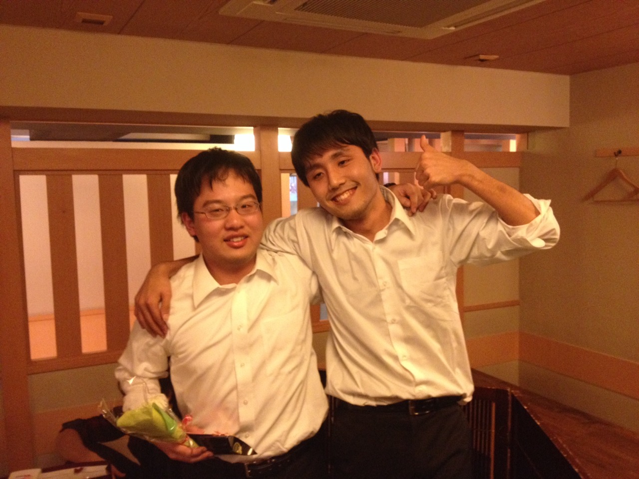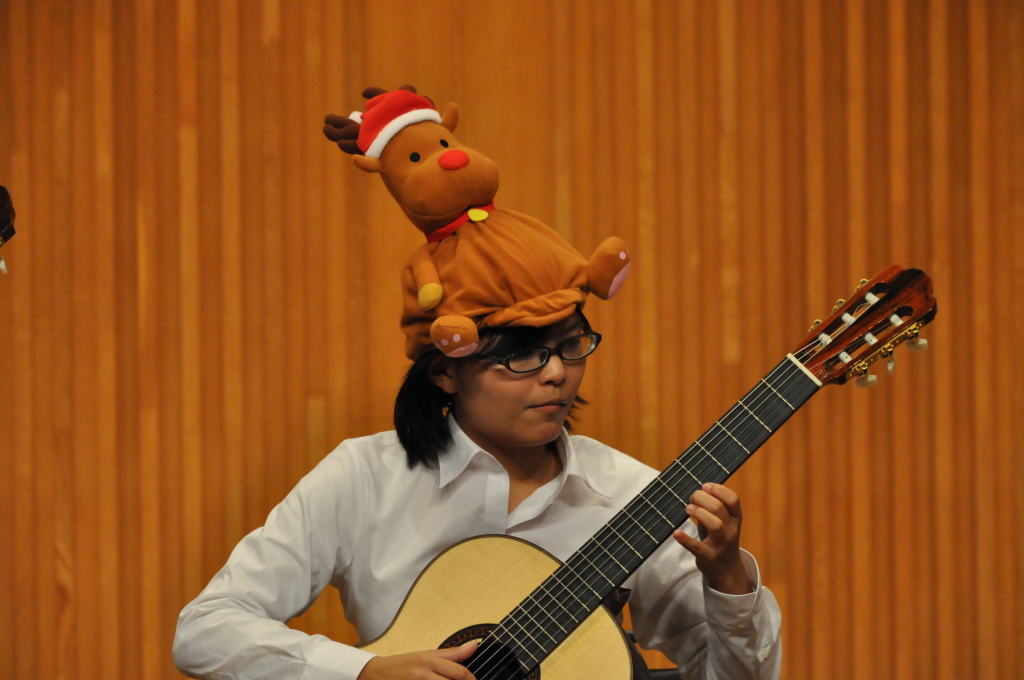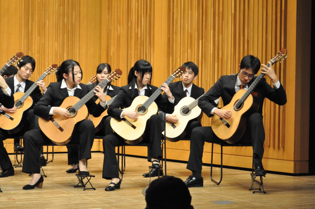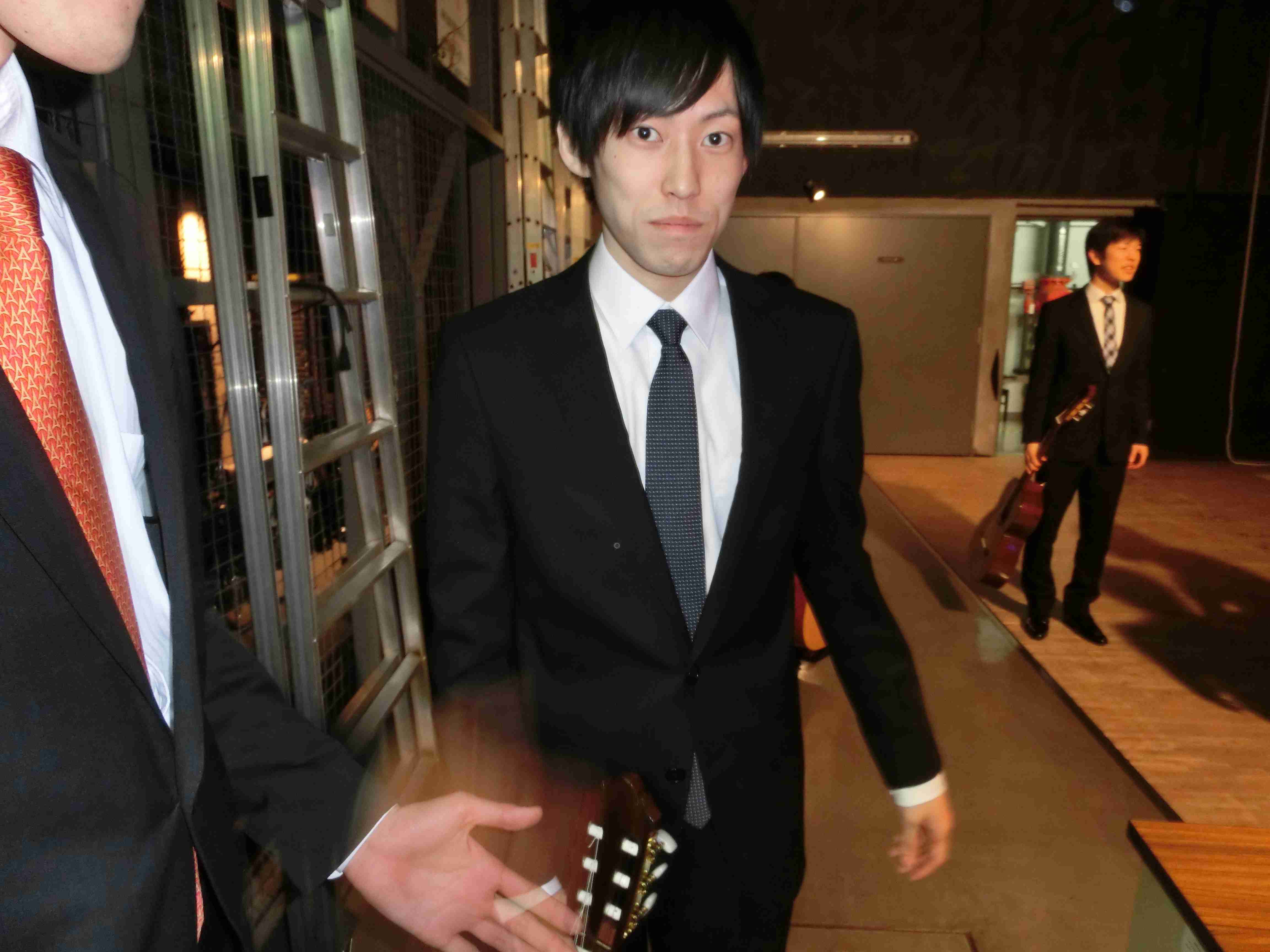 第46回定期演奏会!! 活動記録 2014年01月26日 12月6日(金)に、中央大学古典ギタークラブの第46回定期演奏会が、パルテノン多摩にて開催されました!朝早くに集合し、動きの確認やリハーサルなど開演までの入念な準備をします。 演奏会の総指揮を取る古澤。頼れる男とは彼のこと。 男子部屋の様子。黒田さんがパンフに写る自分を何度も見ていました。 リハーサル裏ドア前の様子。緊張しつつも楽しみながら本番に備えます。また、今年は様々な衣装を揃えました。 東風のハットとネクタイ。カッコいい! さっそくハットで被るコントラバヒッシモ。 雪だるまの調節に余念がない古澤。 今年は曲数が多かったので、リハーサルの終了時刻が予定を大幅に過ぎたりとハプニングもありましたが、無事進行することが出来ました。 この後円陣を組んで気合を入れます。部長が何て言ってたかは覚えてないです。 出番が待ちきれない!そしてついに!待ちに待った演奏会がスタート! ープログラム0ー『Wedding Bell』二人が会場を温かい雰囲気に包みます。衣装すごいです。私たち、結婚します。 ープログラム1ー『ドラえもんのうた』最初の掛け声に全てを込めました。ギターは僕たちを引き合わせたひみつ道具のようなものでした。(加賀江) ープログラム2ー『東風』全体合奏を編曲してくださった大野元毅先生にギターアレンジを手掛けていただきました。5人とも曲の不思議でカッコいい世界観を表現出来ていたと思います。 ープログラム3ー『リベルタンゴ』2年生5人によるピアソラのリベルタンゴ。情熱的で激しい旋律と、最後の荒井の指パッチンに注目です。 荒井の指パッチンを真似する一年生たち。ープログラム4ー『セビーリャ』ぐっさんの堂々とした演奏。来年も独奏で出演すれば定演独奏皆勤賞です。 ープログラム5ー『Summer』季節は反対ですが、人生を思い返したくなるような味わい深い演奏。これからどんな困難にぶつかっても、一輪のひまわりのように強く咲き続けます。(加賀江) ープログラム6ー『September』新入生合奏。大勢のお客様を前に、自信を持って楽しく演奏出来たようです。ナイスバーディア。 ープログラム7ー『光の街』佐藤弘和先生作曲。6人の予定が合わず練習に苦労したようですが、本番ではタイトルの様にきらびやかな演奏を届けてくれました。 ープログラム8ー『コントラバヒッシモ』不思議な世界を表現したピアソラの楽曲。乙女たち4人が繰り広げる一つの物語は見事にまとまっていました。 ープログラム9ー『Streets of London』2年生2人による二重奏。彼らのような演奏者が、これからのコテギを背負っていくのだと確信できる演奏でした。 ープログラム10ー『亡き王女の為のセプテッド』ほっしーの独奏。春からひたすら独奏に挑戦し続けた彼は、現役最後の舞台で存在感のある演奏を披露しました。 ープログラム11-『アメイジンググレイス』サンタ、雪だるま、トナカイに操られた4人による重奏。頭上に目が行きがちですが、演奏もアメイジングでした。 ープログラム12-『情熱大陸』OB寺島さんのアレンジ。2年生のソロパートが光る、激しく情熱に溢れた演奏でした。 ープログラム13ー『トルコ行進曲』ギターでの再現が難しいとされるこの曲に挑戦した4人。ミスもありましたが、勇ましい軍隊の行進が表現できていたと思います。 ープログラム14-『四大元素より~水~』難易度の高いこの曲を、膨大な練習量により弾きこなした英雄4人。次は火に挑戦してもらいたいです。 ープログラム15ー『龍馬伝』師弟による1年ぶりの二重奏。現代に龍馬が蘇ったかのような演奏でした。すいません調子乗りました。 ープログラム16ー『想いの届く日』一年越しの想いを、現役最後の舞台に届けました。彼の努力が詰まった独奏です。独重奏のトリにこれ以上のない演奏でした。 部長、副部長挨拶。想いの溢れる温かいスピーチでした。 ー全体合奏1ー『惑星より~木星~』大野元毅先生編曲。400小節以上に渡る大曲であり、幾度となく挫折しかけましたが、何とかこの舞台で形にすることが出来ました。それは演奏者と、毎週私たちをまとめ上げてくれた指揮者の絶え間ない努力によるものです。 ー全体合奏2ー『ジョン・ウィリアムズメドレー(映画のテーマソングメドレー)』佐藤弘和先生編曲。ヘドウィグのテーマ(ハリー・ポッター)→ハリーの不思議な世界(ハリー・ポッター)→レイダース・マーチ(インディー・ジョーンズ)→帝国のマーチ(スター・ウォーズ)→スター・ウォーズのテーマ(スター・ウォーズ)→E.T.のテーマ(E.T.)という構成になっており、誰もが耳にしたことのあるメロディーを一度に楽しめる楽曲となっています。衣装も今までに着たものを総動員し、最後に相応しい華やかな合奏となりました!こうして、第46回定期演奏会は幕を閉じ、同時に私たちも現役を引退しました。 控室前の通路。ギターの数だけドラマがあります。 名残り惜しいですが、最後の締めとして飲み会に! 後輩の皆が引退す