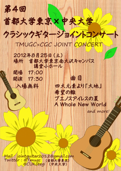 第4回ジョイントコンサートのお知らせ お知らせ 2012年07月27日 あっついですね連日気温30℃超えですね。アツいと言ったらサッカー昨日日本勝ちましたね!オリンピックも今日開会式ですね!アツい!アツい!色々アツいですがアツいといったらこちらもアツいですよ(^^)/!●第4回首都大学東京×中央大学ジョイントコンサート●*日時:8月25日(土)*場所:首都大学東京南大沢キャンパス講堂小ホール*開場:17:00 開演17:30 *曲目・四大元素より「大地」/F.クレンジャンス、・A Whole New World/A.メンケン・ブエノスアイレスの夏/A.ピアソラ・secret base~君がくれたもの~/ZONE などなど!!もちろん入場無料です。そう、なんとまだ4回目のイベントなんです。各大学有志がギターと汗と涙にのまれながら奮闘してます。ひと夏の思い出に、クラシックギターの音色を聴いて涼んでみてはいかがでしょうか。 こんなかわいらしいポスターもできちゃったりなんかしてます。さがしてみてください。皆様健康に気を付け、良い夏をお過ごしくださいby今年の夏は勉強もギターも遊びも頑張っちゃうもんね!なガガより