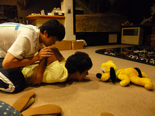 師匠にひざまくらしてもらえてご満悦なF君。(右下)