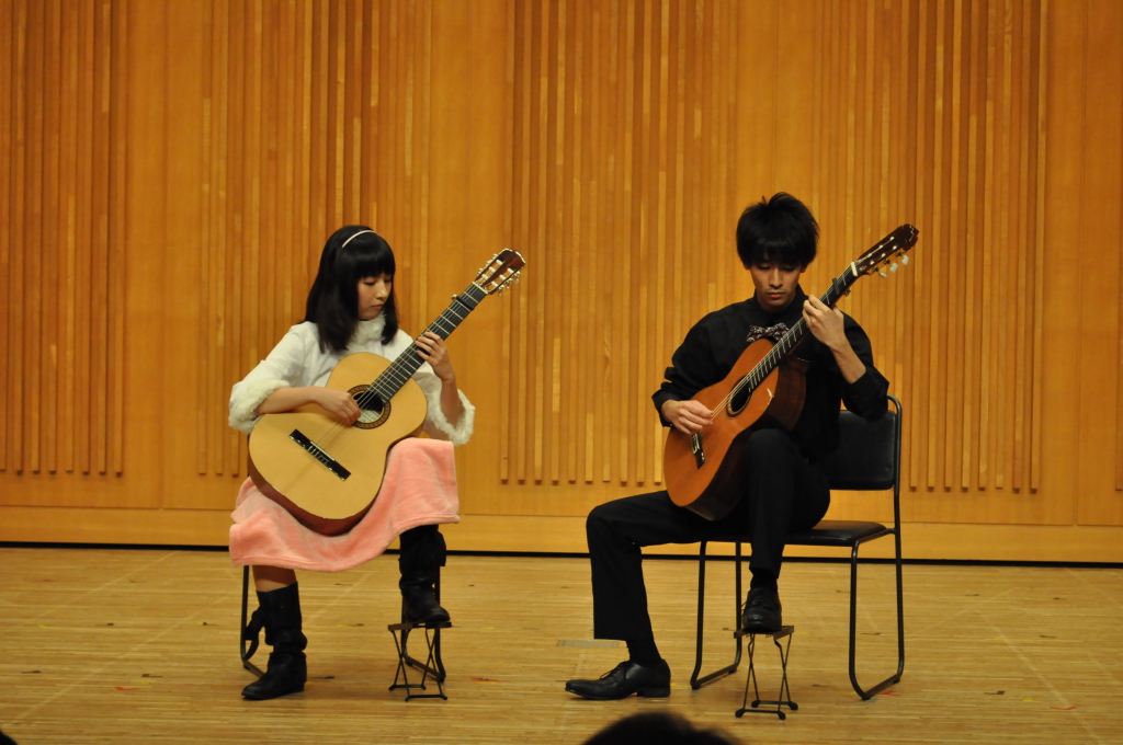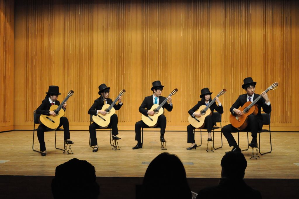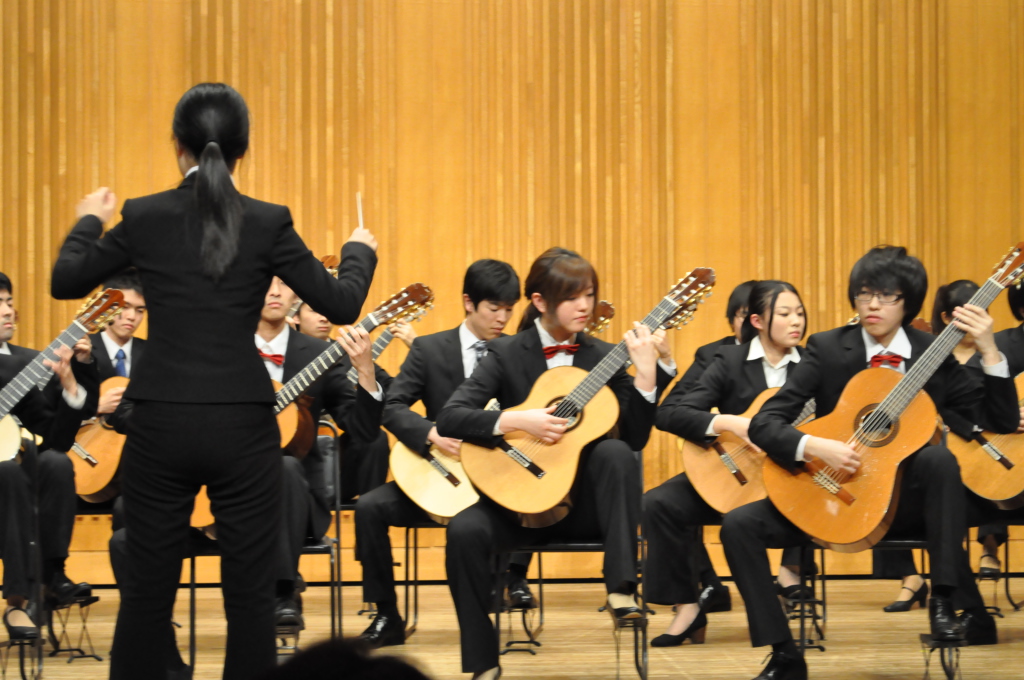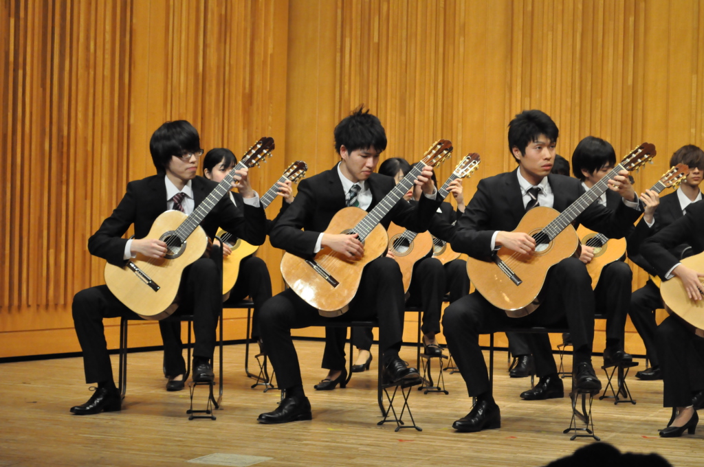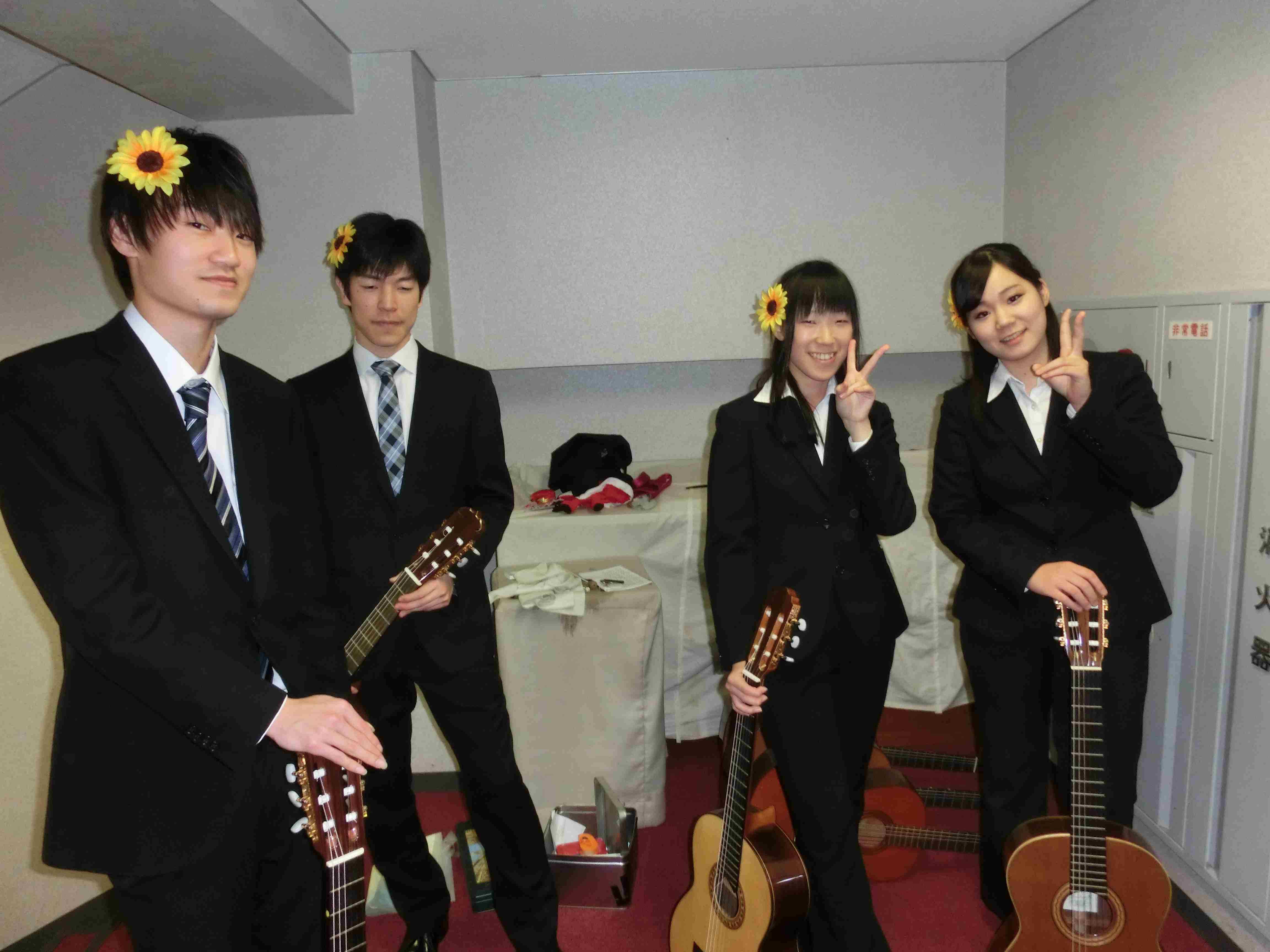 第46回定期演奏会!! 活動記録 2014年01月26日 12月6日(金)に、中央大学古典ギタークラブの第46回定期演奏会が、パルテノン多摩にて開催されました!朝早くに集合し、動きの確認やリハーサルなど開演までの入念な準備をします。 演奏会の総指揮を取る古澤。頼れる男とは彼のこと。 男子部屋の様子。黒田さんがパンフに写る自分を何度も見ていました。 リハーサル裏ドア前の様子。緊張しつつも楽しみながら本番に備えます。また、今年は様々な衣装を揃えました。 東風のハットとネクタイ。カッコいい! さっそくハットで被るコントラバヒッシモ。 雪だるまの調節に余念がない古澤。 今年は曲数が多かったので、リハーサルの終了時刻が予定を大幅に過ぎたりとハプニングもありましたが、無事進行することが出来ました。 この後円陣を組んで気合を入れます。部長が何て言ってたかは覚えてないです。 出番が待ちきれない!そしてついに!待ちに待った演奏会がスタート! ープログラム0ー『Wedding Bell』二人が会場を温かい雰囲気に包みます。衣装すごいです。私たち、結婚します。 ープログラム1ー『ドラえもんのうた』最初の掛け声に全てを込めました。ギターは僕たちを引き合わせたひみつ道具のようなものでした。(加賀江) ープログラム2ー『東風』全体合奏を編曲してくださった大野元毅先生にギターアレンジを手掛けていただきました。5人とも曲の不思議でカッコいい世界観を表現出来ていたと思います。 ープログラム3ー『リベルタンゴ』2年生5人によるピアソラのリベルタンゴ。情熱的で激しい旋律と、最後の荒井の指パッチンに注目です。 荒井の指パッチンを真似する一年生たち。ープログラム4ー『セビーリャ』ぐっさんの堂々とした演奏。来年も独奏で出演すれば定演独奏皆勤賞です。 ープログラム5ー『Summer』季節は反対ですが、人生を思い返したくなるような味わい深い演奏。これからどんな困難にぶつかっても、一輪のひまわりのように強く咲き続けます。(加賀江) ープログラム6ー『September』新入生合奏。大勢のお客様を前に、自信を持って楽しく演奏出来たようです。ナイスバーディア。 ープログラム7ー『光の街』佐藤弘和先生作曲。6人の予定が合わず練習に苦労したようですが、本番ではタイトルの様にきらびやかな演奏を届けてくれました。 ープログラム8ー『コントラバヒッシモ』不思議な世界を表現したピアソラの楽曲。乙女たち4人が繰り広げる一つの物語は見事にまとまっていました。 ープログラム9ー『Streets of London』2年生2人による二重奏。彼らのような演奏者が、これからのコテギを背負っていくのだと確信できる演奏でした。 ープログラム10ー『亡き王女の為のセプテッド』ほっしーの独奏。春からひたすら独奏に挑戦し続けた彼は、現役最後の舞台で存在感のある演奏を披露しました。 ープログラム11-『アメイジンググレイス』サンタ、雪だるま、トナカイに操られた4人による重奏。頭上に目が行きがちですが、演奏もアメイジングでした。 ープログラム12-『情熱大陸』OB寺島さんのアレンジ。2年生のソロパートが光る、激しく情熱に溢れた演奏でした。 ープログラム13ー『トルコ行進曲』ギターでの再現が難しいとされるこの曲に挑戦した4人。ミスもありましたが、勇ましい軍隊の行進が表現できていたと思います。 ープログラム14-『四大元素より~水~』難易度の高いこの曲を、膨大な練習量により弾きこなした英雄4人。次は火に挑戦してもらいたいです。 ープログラム15ー『龍馬伝』師弟による1年ぶりの二重奏。現代に龍馬が蘇ったかのような演奏でした。すいません調子乗りました。 ープログラム16ー『想いの届く日』一年越しの想いを、現役最後の舞台に届けました。彼の努力が詰まった独奏です。独重奏のトリにこれ以上のない演奏でした。 部長、副部長挨拶。想いの溢れる温かいスピーチでした。 ー全体合奏1ー『惑星より~木星~』大野元毅先生編曲。400小節以上に渡る大曲であり、幾度となく挫折しかけましたが、何とかこの舞台で形にすることが出来ました。それは演奏者と、毎週私たちをまとめ上げてくれた指揮者の絶え間ない努力によるものです。 ー全体合奏2ー『ジョン・ウィリアムズメドレー(映画のテーマソングメドレー)』佐藤弘和先生編曲。ヘドウィグのテーマ(ハリー・ポッター)→ハリーの不思議な世界(ハリー・ポッター)→レイダース・マーチ(インディー・ジョーンズ)→帝国のマーチ(スター・ウォーズ)→スター・ウォーズのテーマ(スター・ウォーズ)→E.T.のテーマ(E.T.)という構成になっており、誰もが耳にしたことのあるメロディーを一度に楽しめる楽曲となっています。衣装も今までに着たものを総動員し、最後に相応しい華やかな合奏となりました!こうして、第46回定期演奏会は幕を閉じ、同時に私たちも現役を引退しました。 控室前の通路。ギターの数だけドラマがあります。 名残り惜しいですが、最後の締めとして飲み会に! 後輩の皆が引退す