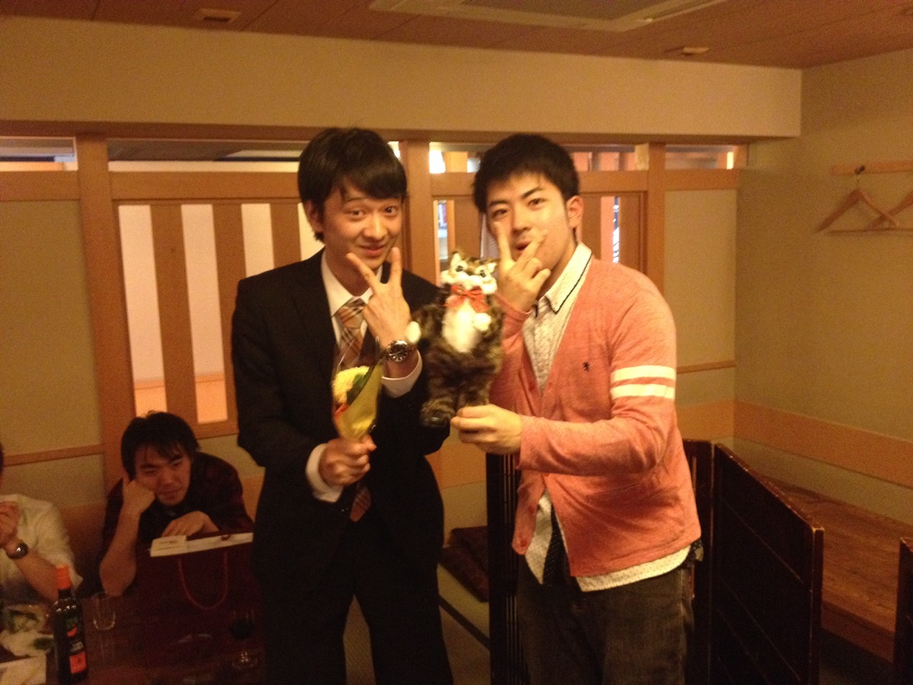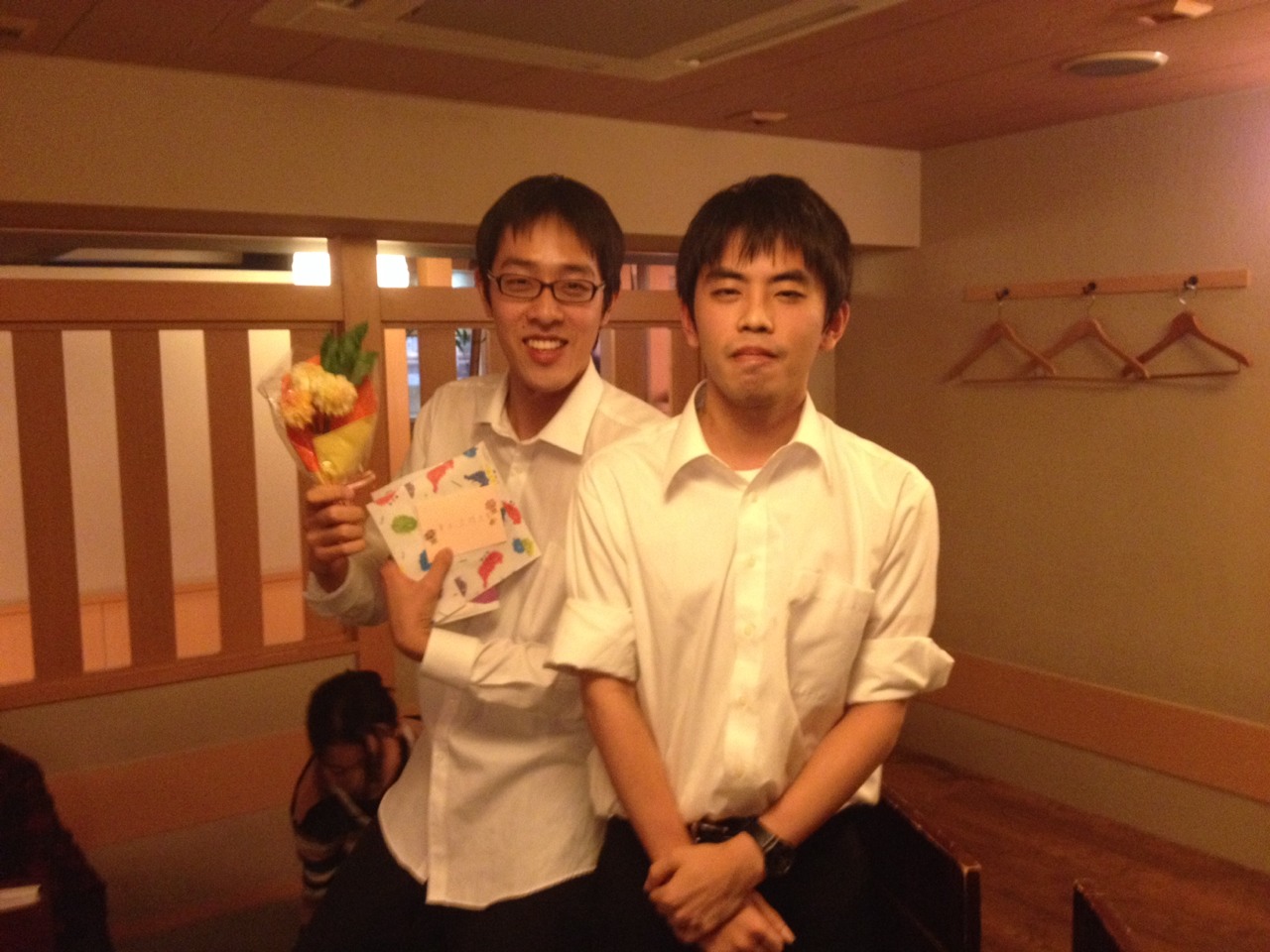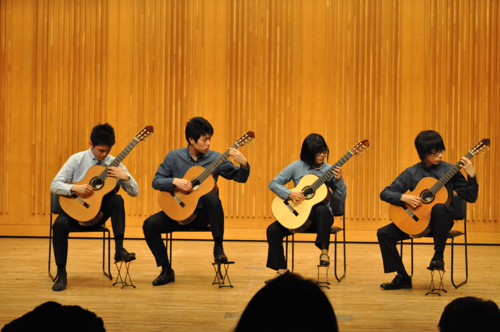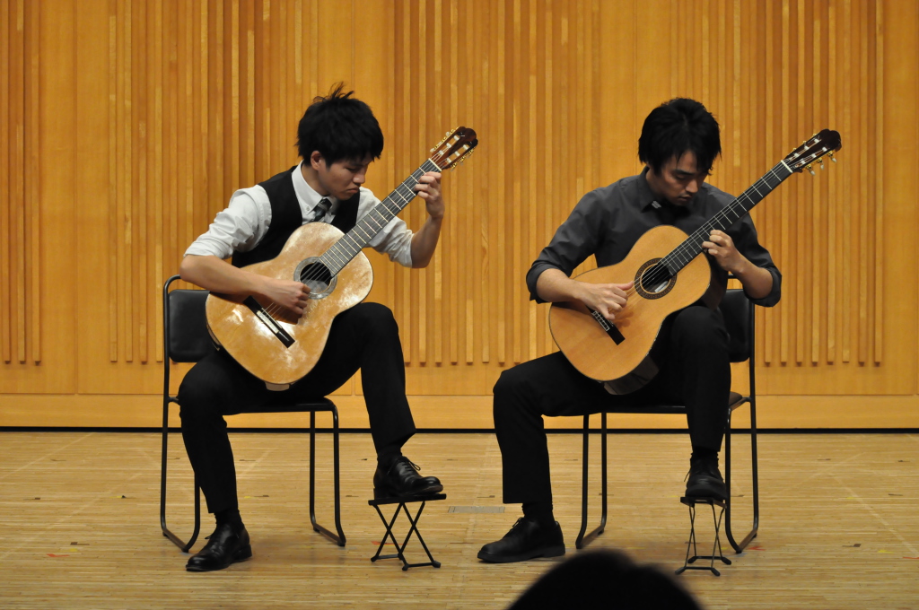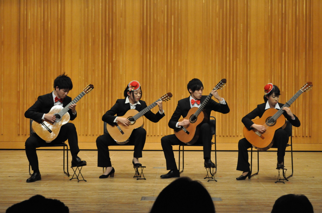 第46回定期演奏会!! 活動記録 2014年01月26日 12月6日(金)に、中央大学古典ギタークラブの第46回定期演奏会が、パルテノン多摩にて開催されました!朝早くに集合し、動きの確認やリハーサルなど開演までの入念な準備をします。 演奏会の総指揮を取る古澤。頼れる男とは彼のこと。 男子部屋の様子。黒田さんがパンフに写る自分を何度も見ていました。 リハーサル裏ドア前の様子。緊張しつつも楽しみながら本番に備えます。また、今年は様々な衣装を揃えました。 東風のハットとネクタイ。カッコいい! さっそくハットで被るコントラバヒッシモ。 雪だるまの調節に余念がない古澤。 今年は曲数が多かったので、リハーサルの終了時刻が予定を大幅に過ぎたりとハプニングもありましたが、無事進行することが出来ました。 この後円陣を組んで気合を入れます。部長が何て言ってたかは覚えてないです。 出番が待ちきれない!そしてついに!待ちに待った演奏会がスタート! ープログラム0ー『Wedding Bell』二人が会場を温かい雰囲気に包みます。衣装すごいです。私たち、結婚します。 ープログラム1ー『ドラえもんのうた』最初の掛け声に全てを込めました。ギターは僕たちを引き合わせたひみつ道具のようなものでした。(加賀江) ープログラム2ー『東風』全体合奏を編曲してくださった大野元毅先生にギターアレンジを手掛けていただきました。5人とも曲の不思議でカッコいい世界観を表現出来ていたと思います。 ープログラム3ー『リベルタンゴ』2年生5人によるピアソラのリベルタンゴ。情熱的で激しい旋律と、最後の荒井の指パッチンに注目です。 荒井の指パッチンを真似する一年生たち。ープログラム4ー『セビーリャ』ぐっさんの堂々とした演奏。来年も独奏で出演すれば定演独奏皆勤賞です。 ープログラム5ー『Summer』季節は反対ですが、人生を思い返したくなるような味わい深い演奏。これからどんな困難にぶつかっても、一輪のひまわりのように強く咲き続けます。(加賀江) ープログラム6ー『September』新入生合奏。大勢のお客様を前に、自信を持って楽しく演奏出来たようです。ナイスバーディア。 ープログラム7ー『光の街』佐藤弘和先生作曲。6人の予定が合わず練習に苦労したようですが、本番ではタイトルの様にきらびやかな演奏を届けてくれました。 ープログラム8ー『コントラバヒッシモ』不思議な世界を表現したピアソラの楽曲。乙女たち4人が繰り広げる一つの物語は見事にまとまっていました。 ープログラム9ー『Streets of London』2年生2人による二重奏。彼らのような演奏者が、これからのコテギを背負っていくのだと確信できる演奏でした。 ープログラム10ー『亡き王女の為のセプテッド』ほっしーの独奏。春からひたすら独奏に挑戦し続けた彼は、現役最後の舞台で存在感のある演奏を披露しました。 ープログラム11-『アメイジンググレイス』サンタ、雪だるま、トナカイに操られた4人による重奏。頭上に目が行きがちですが、演奏もアメイジングでした。 ープログラム12-『情熱大陸』OB寺島さんのアレンジ。2年生のソロパートが光る、激しく情熱に溢れた演奏でした。 ープログラム13ー『トルコ行進曲』ギターでの再現が難しいとされるこの曲に挑戦した4人。ミスもありましたが、勇ましい軍隊の行進が表現できていたと思います。 ープログラム14-『四大元素より~水~』難易度の高いこの曲を、膨大な練習量により弾きこなした英雄4人。次は火に挑戦してもらいたいです。 ープログラム15ー『龍馬伝』師弟による1年ぶりの二重奏。現代に龍馬が蘇ったかのような演奏でした。すいません調子乗りました。 ープログラム16ー『想いの届く日』一年越しの想いを、現役最後の舞台に届けました。彼の努力が詰まった独奏です。独重奏のトリにこれ以上のない演奏でした。 部長、副部長挨拶。想いの溢れる温かいスピーチでした。 ー全体合奏1ー『惑星より~木星~』大野元毅先生編曲。400小節以上に渡る大曲であり、幾度となく挫折しかけましたが、何とかこの舞台で形にすることが出来ました。それは演奏者と、毎週私たちをまとめ上げてくれた指揮者の絶え間ない努力によるものです。 ー全体合奏2ー『ジョン・ウィリアムズメドレー(映画のテーマソングメドレー)』佐藤弘和先生編曲。ヘドウィグのテーマ(ハリー・ポッター)→ハリーの不思議な世界(ハリー・ポッター)→レイダース・マーチ(インディー・ジョーンズ)→帝国のマーチ(スター・ウォーズ)→スター・ウォーズのテーマ(スター・ウォーズ)→E.T.のテーマ(E.T.)という構成になっており、誰もが耳にしたことのあるメロディーを一度に楽しめる楽曲となっています。衣装も今までに着たものを総動員し、最後に相応しい華やかな合奏となりました!こうして、第46回定期演奏会は幕を閉じ、同時に私たちも現役を引退しました。 控室前の通路。ギターの数だけドラマがあります。 名残り惜しいですが、最後の締めとして飲み会に! 後輩の皆が引退す